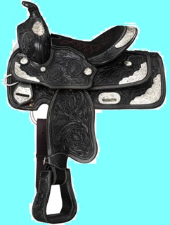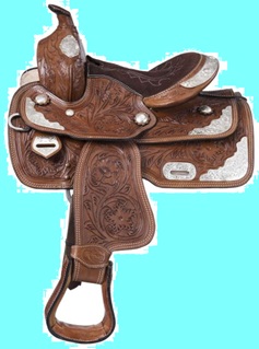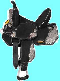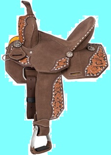 This stunning suede saddle features bold color complementing tooled leather overlays with a fun buckstitch edge and thick white stitching. The deep suede seat and high pommel offer excellent security during athletic maneuvers. Finished with classic antiqued silver conchos and aluminum stirrups with rubber tread. A great saddle for the barrel racer, but also comfortable for everyday use such as trail riding! Swell: 13", Gullet: 7", Cantle: 6", Skirt: 21" x 24", Rigging: Drop D, Weight: 17.5lbs, Tie Strap: 1 3/4" x 46", Off Billet: 1 3/4" x 18", Stirrup Neck: 2 1/2", Horn Height: 3 1/4", Horn Diameter: 2", Inseam: 24"-32" (measurements vary by seat size).