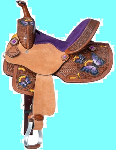 The whimsical Tough1 Butterfly Saddle combines fun with function! Adorned with beautiful hand-painted butterflies, brightly colored sunflowers and sparkling gemstone conchos, this saddle will look great on any kid's horse or pony. The deep suede seat, with embroidered butterfly detail, provides great balance and security for young riders while the roughout jockeys and fenders offer excellent grip for the legs. Other features include stainless steel in-skirt rigging, quick change fender buckles, and lightweight aluminum stirrups. Features Swell: 12 1/2", Gullet: 7", Cantle: 5 1/2", Skirt: 24" x 24", Rigging: In-Skirt, Weight: 24lbs, Tie Strap: 1 3/4" x 56", Off Billet: 1 1/2" x 15", Stirrup Neck: 2 1/2", Horn Height: 4", Horn Diameter: 2 1/2", Inseam: 21"-28"(measurements vary by size)